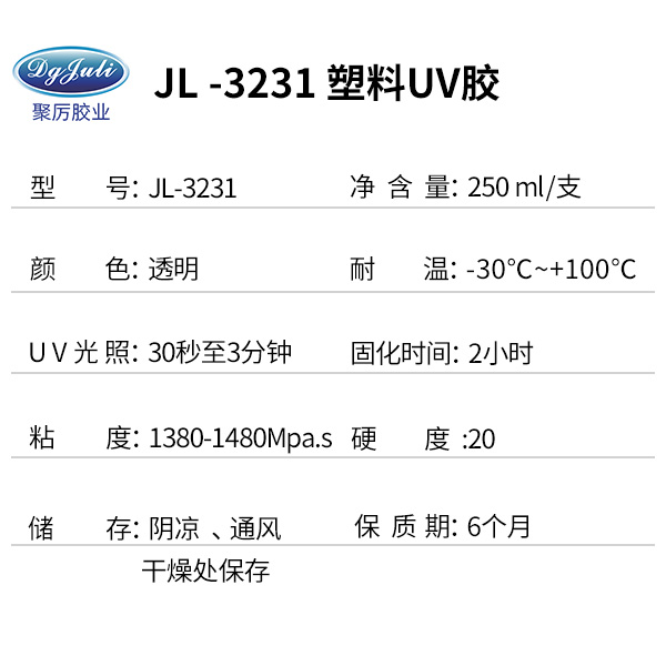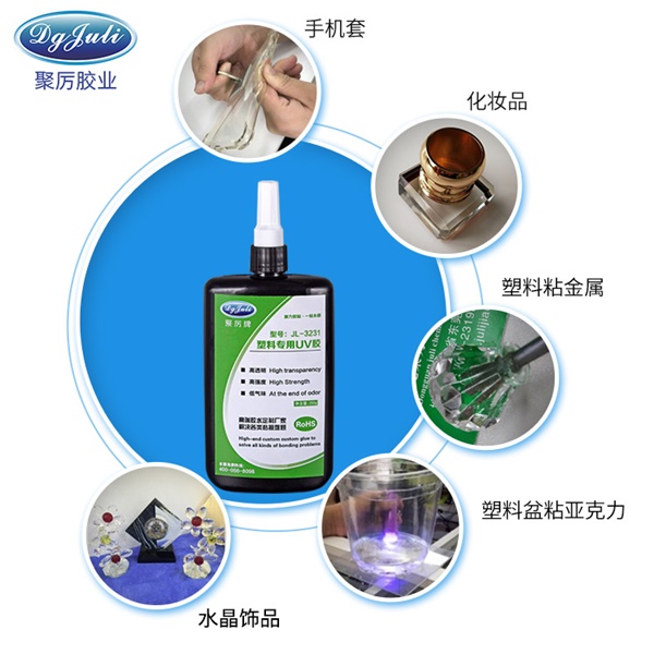 聚厲牌JL-3231塑料UV膠水屬于丙烯酸酯類膠粘劑采用進(jìn)口原材料,應(yīng)用于全透明塑料、工藝品主要PMMA(亞克力)、PC、ABS、PVC、PS、強(qiáng)度比市面上大多數(shù)UV膠有百分之三十五以上提高透明度以及強(qiáng)度,等透明塑料材質(zhì)的粘接有很好的耐腐蝕性好,耐酸堿,耐老化、抗震動(dòng)等優(yōu)點(diǎn)。