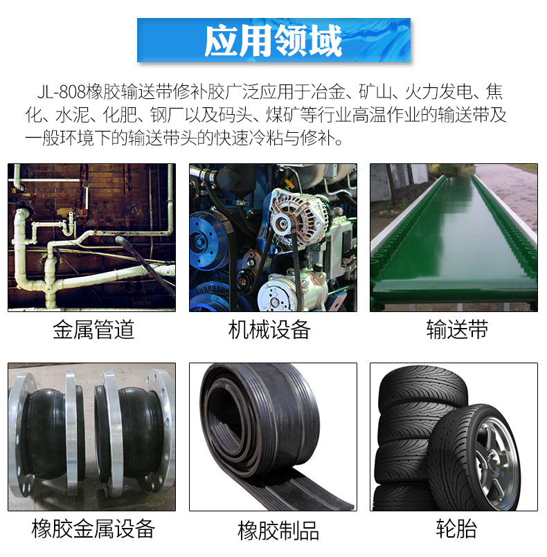 聚厲牌JL-808橡膠輸送帶修補膠是雙組份室溫固化、高性能氯丁膠。具有很強的初粘力和終粘強度,耐高溫性能好。能滿足150℃環境下橡膠與金屬材質快速粘接和修補。具有性能穩定,干燥迅速,易操作,耐老化,耐酸、堿、鹽、水、油等。