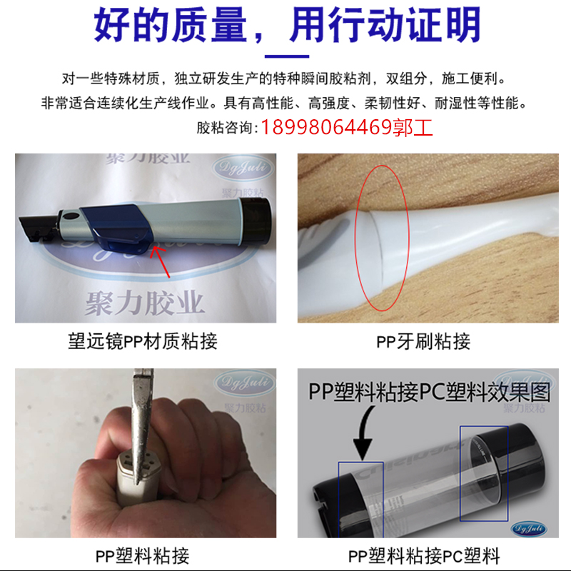 PP材料算得上是比較難粘的一種材料。在PP塑料跟普通的膠水粘接時牢固度很難達到要求,而且粘接后可能會發白 脫膠等。PP塑料的制品有很多,比如洗發水的瓶蓋、兒童玩具、車載充電、PP燈罩等,PP塑料(聚丙烯)無害、無味,密度小,強度、剛度、硬度耐熱性等性能優異。小面積的PP塑料與PP、ABS、PVC、PS、PC、橡膠等材料的粘接可以用JL-406AB高強度PP塑料膠水,聚厲牌JL-406AB PP專用瞬間膠水分為AB兩部分A劑是PP處理劑、B劑是PP粘接劑,AB劑配和使用的效果會更好。