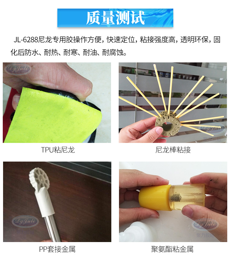 尼龍塑料和電子產(chǎn)品粘接要求粘接強(qiáng)度高,低氣味防水耐老化可以用聚力 JL-6288尼龍塑料專(zhuān)用膠水 ,是一種基于聚氨酯改性的膠黏劑。適用于尼龍與尼龍,或尼龍與其他硬質(zhì)材料的套接
